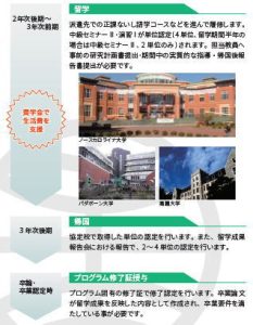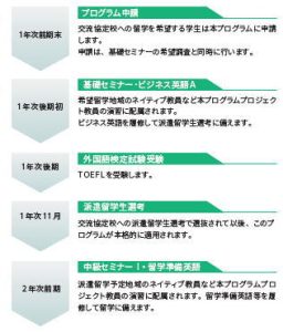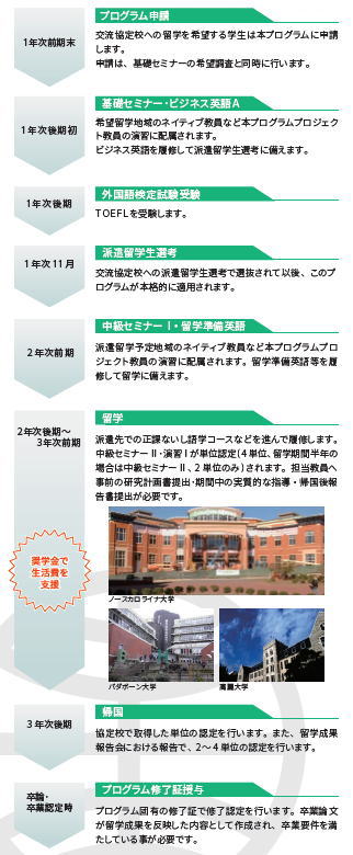 条 件(選抜) 1年次後期に交流協定校派遣留学生選考で選抜されること